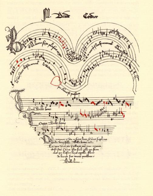 Though its most popular usage occurred in the mid-twentieth century, the first evidence of graphic notation dates back much earlier. Originally called "eye music", these graphic scores bear resemblance to the scores of composers like George Crumb. One of the earliest surviving pieces of eye music is Belle, Bonne, Sage by Baude Cordier, a Renaissance composer. His score, formed in the shape of a heart, was intended to enhance the meaning of the song.