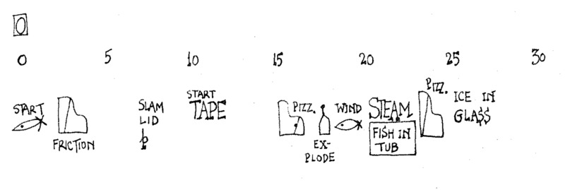 Time-based pictographic scores such as Waterwalk by John Cage, uses a combination of time marking a pictographic notation as instruction on how and when to perform certain actions.