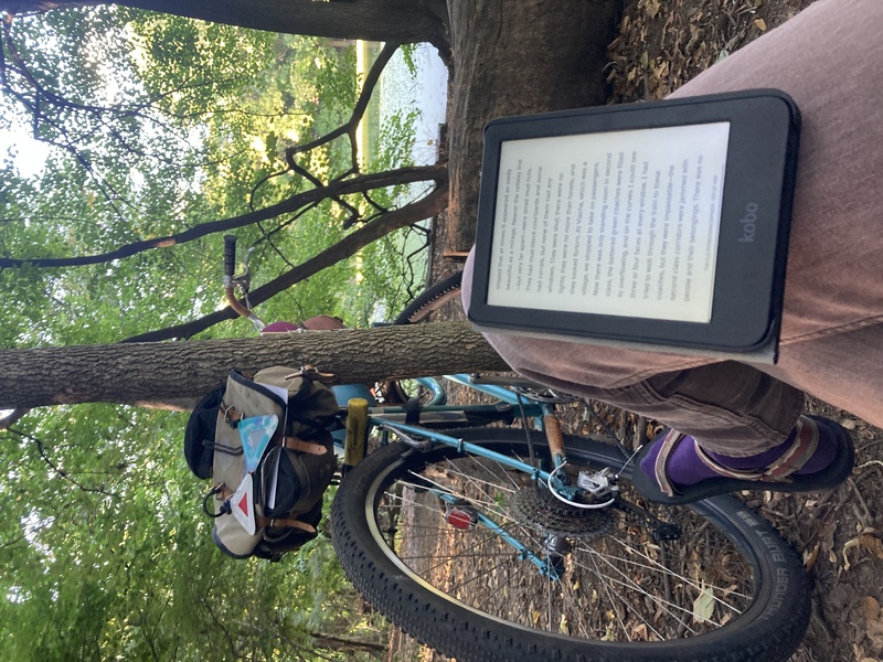 i carefully biked one handed, holding my feast in the freehand and navigating through the park trails to a relatively quiet area. i bike through the woods on the peninsula, sitting near the pond. but it seems impossible to hit my goal of finding some quietude. louder and louder i hear the bumping bass pumping out of the southwest corner of the park where carribean vendors sell jamaican food and families gather in large reunions, that i had biked past earlier that day. i eat my food and try to read, eventually forgetting the bass while i snack. but after my meal i decide to try another corner of the park and work off some of the chicken. i wind up a dirt path that spirals up the tall hill. at the top on its far side from the fields i find an area farthest away from the party zone, and start to set up. but even here i begin to hear competing middle eastern music, egyptian? no matter, thankfully the sound pleases me and i'll be able to read with that, though it soon ends after a few minutes. i take out my ultralight folding chair i purchased on ebay (the REI camp chair) and set up under the trees. i pull out my new kobo clara bw ereader and queue up The Old Patagonian Express, which i've been reading for the past week and a half, checked out from my library via the Overdrive app.