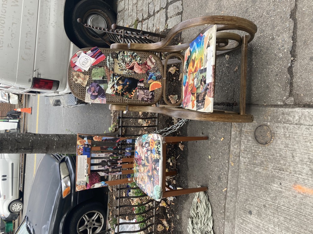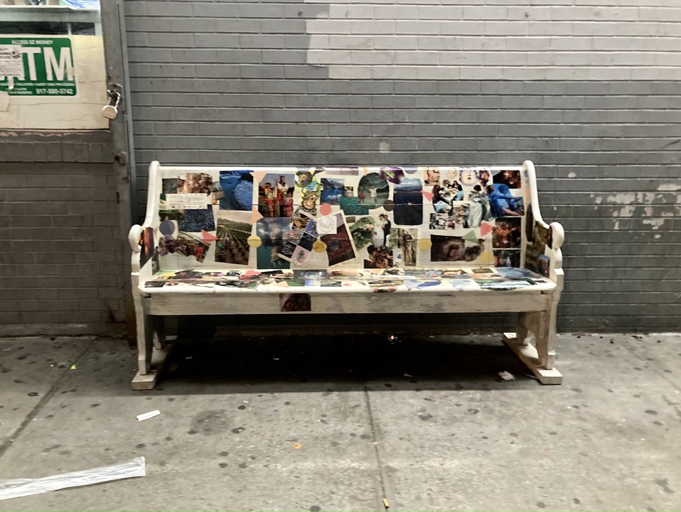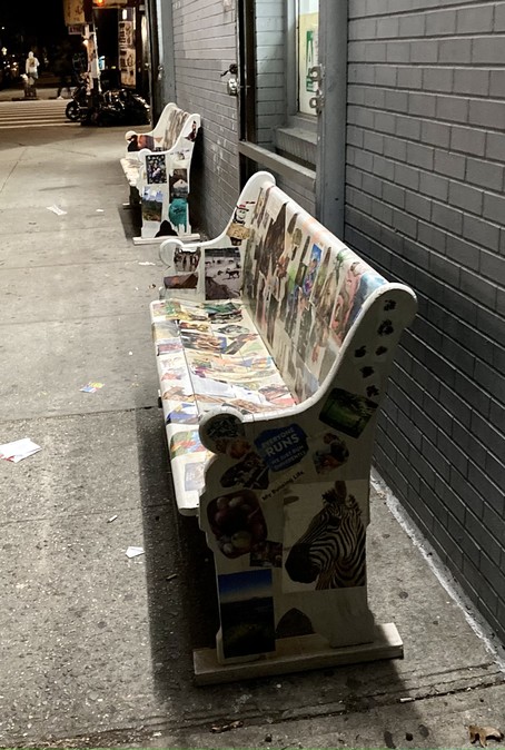 A few weeks ago my neighborhood had an old-fashioned community yard sale. This kind of thing feels rare in New York, to have coordinated between neighbors. At one of the large houses nearby I saw they had out what looked like church pews and old seats. They had what appeared to be pictures from magazines cut out and glued all over the benches. I didn't know if they were for sale or what the story was. I didn't explore. I just biked on by. Imagine my surprise the next day to see these pews and benches and seats pop up all over the neighborhood. The seating has appeared where it's been missing: in front of an apartment building, two outside of a laundromat, one on a busy street. And of course, they are always filled with people. At all hours of the day you can find people sitting, resting, talking. One time I saw an unhoused man sitting, asleep on a bench. And so what. The next day he was gone and others were sitting in his place. I've been wanting to photograph them but they always have people sitting on them and I don't want to photograph people in public. So I returned in the late evening to take some photos, when less people are out.