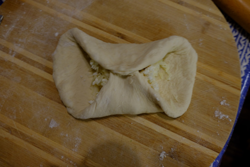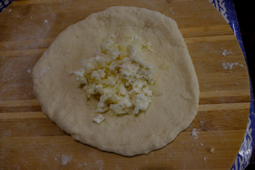 On a flour-dusted board, split up the dough and squish (or roll) into rounds maybe 6-10 inches. Plop a wallop (an ice-cream scoop) of cheese in the middle, then grab two sides and squish together to close the top. Repeat on remaining sides, making a large round dumpling. Squish any holes closed with your fingers, and gently flatten. Turn it upside down and flatten some more, until you have a disk.