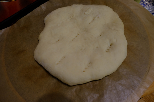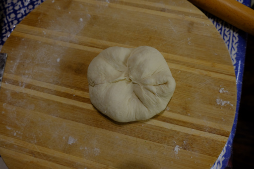 Now roll it very gently with a pin (or a bottle, in a pinch) to flatten it more, flipping occasionally. If you are gentle, the skin is not broken (it will be thin in places), and you have a disk that's pretty flat - maybe 15mm high. If you like butter, rub the top with a stick of (soft) butter.