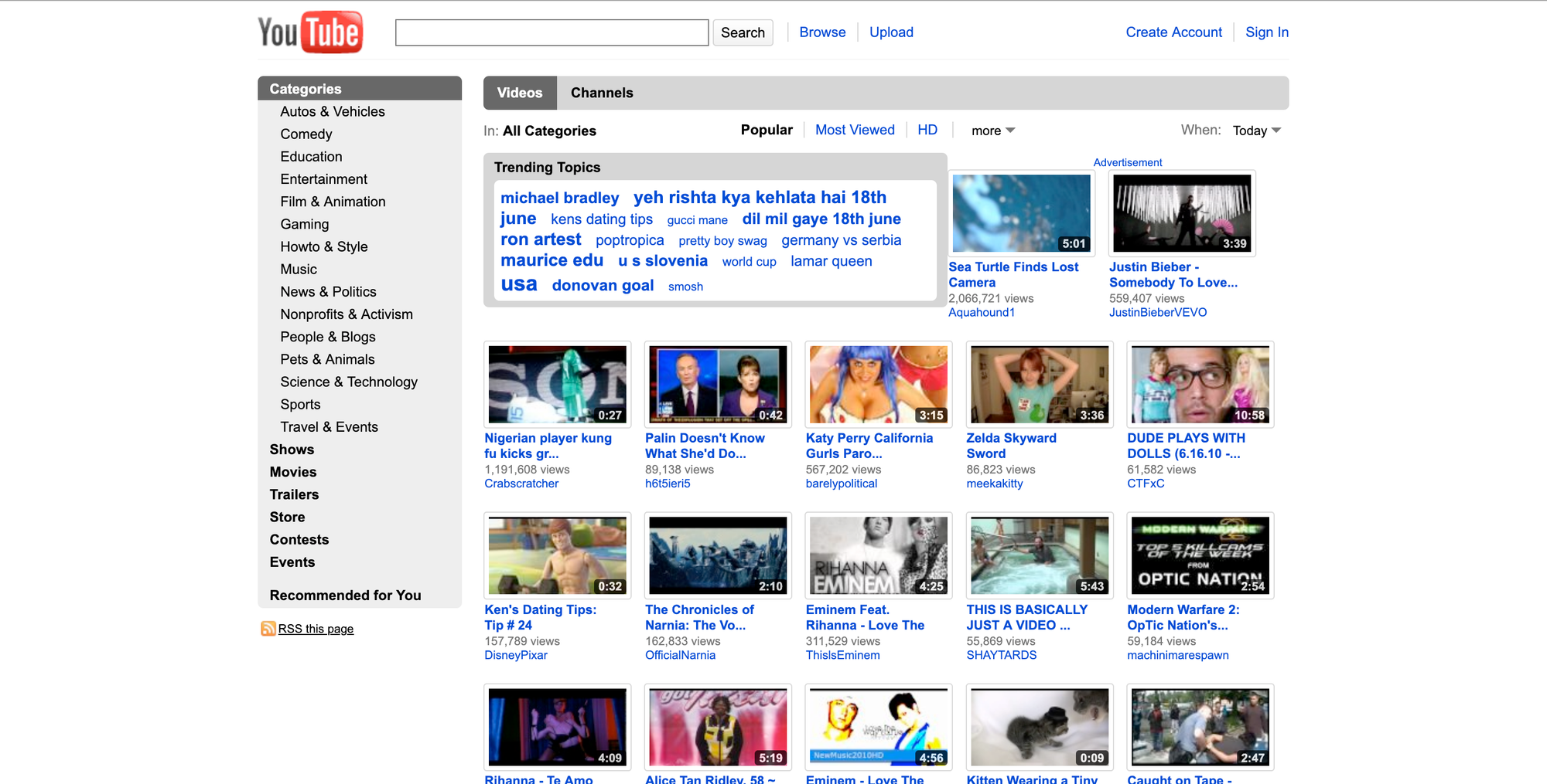 Я помню YouTube образца 2008 года. Дизайн в оттенках серого, скевоморфизм в кнопочках, примитивный в своих органах управления плеер... Но самое главное — интересные видео, снятые зачастую без какой-либо подготовки. А прилично сделанным считалось видео, снятое на фоне простыни под целыми двумя лампочками.