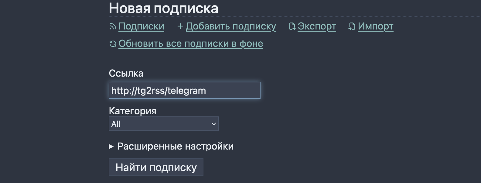 [🖼️ add subscription] [6] Использовать очень легко. Конфигурация (пока) не требуется. Указываем вместо хоста http://tg2rss/адрес_канала и читалка начинает опрашивать фид.