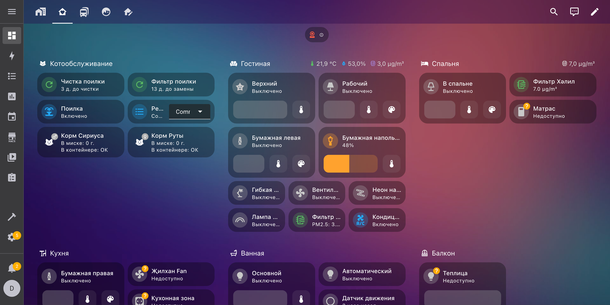Мне кажется, это такая вещь, которую большинство селфхостят в первую очередь. Интересно, сложно, и позволяет сделать хитрые автоматизации. Например, моя любимая — если автоматический лоток сообщает, что им воспользовались — мощность очистителей воздуха повышается на следующие пять минут. И это делают разные девайсы от разных фирм. Короче, прикольный единый интерфейс ко всяким домашним и полезным внешним штукам. И про это всё тоже есть пост [58].