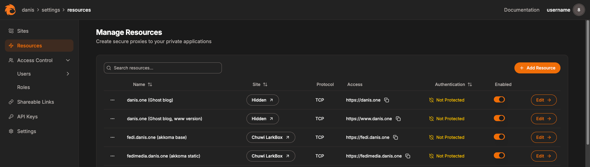 [🖼️ selfhost pangolin] [15] Вот так выглядит кусочек панели панголина Помимо этого он по умолчанию оборачивает весь веб-трафик в Zero Trust подход, когда для доступа к сервису надо пройти авторизацию от самого панголина. В моём случае это довольно редкий кейс, но для корпоративного доступа может быть весьма полезно.