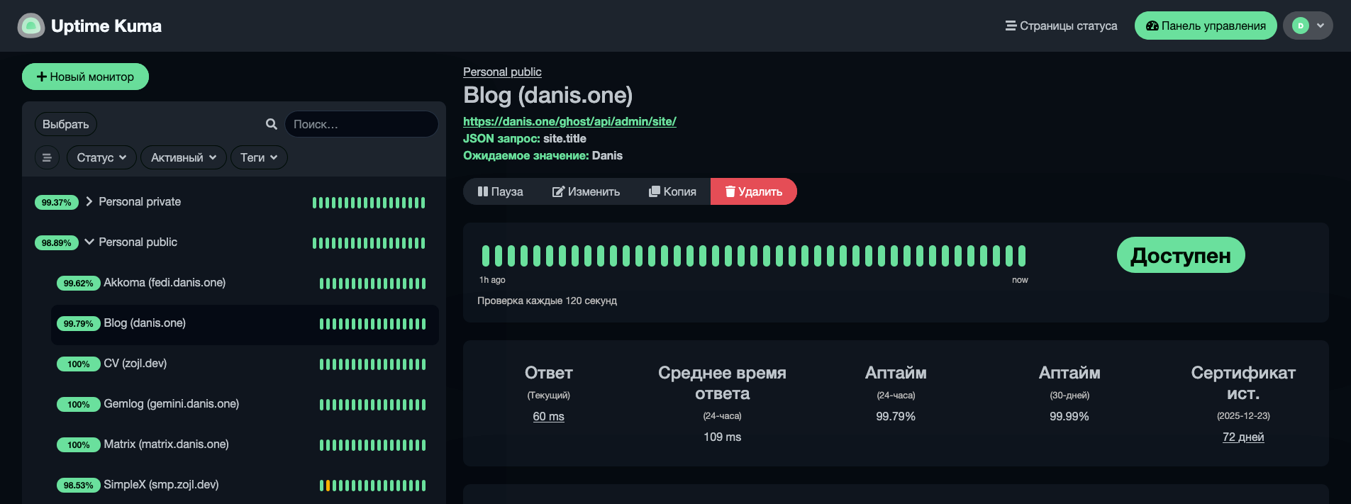 Uptime Kuma [20] — мониторинг [🖼️ selfhost uptimekuma] [21] Мониторинговых сервисов полно, куму я выбрал наугад. Удобно, довольно гибко, а главное — есть нотификации, что где-то что-то упало или истекает SSL-сертификат. Держу его вместе с панголином, что не очень хорошо — если упадёт весь сервер, то я об этом не узнаю. Местами хочется больше возможностей, но в целом неплохо.
