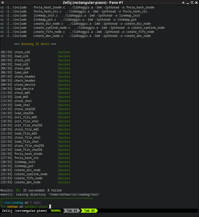 What you get is a nice pretty printed test run showing the number of passes and fails. Adding a new test incolves creating a test executable and adding it to the "tests" variable in the Makefile. Easy peasy, and allows me to do TDD without any extra frameworks or tooling.