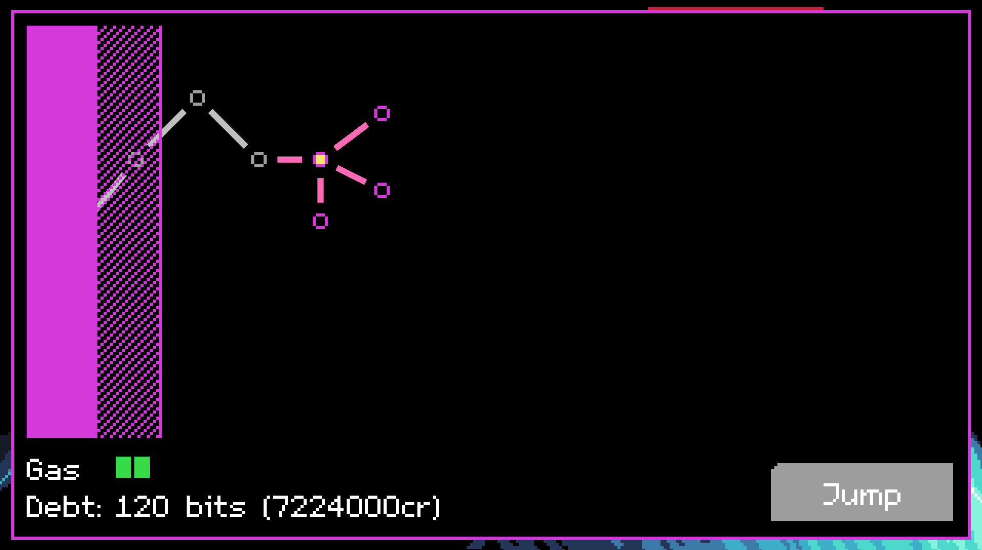 The combined concept suggested that a new, sci-fi twist on the debt problem was required, and that's where the idea of a constantly growing cryptocurrency debt came in. I've been thinking about cryptocurrencies a lot lately since they're going through another hype cycle. One commonly touted feature of them (or some, like Bitcoin, at least), is that they're deflationary, so any debt denominated in them would constantly grow in value instead of decreasing in value like debts denominated in inflationary fiat currencies. This seemed like the perfect notion for the bizarre world of my game. It doesn't really have any impact on the gameplay, but I think it's a nice bit of narrative flavour, and it fits the theme perfectly.