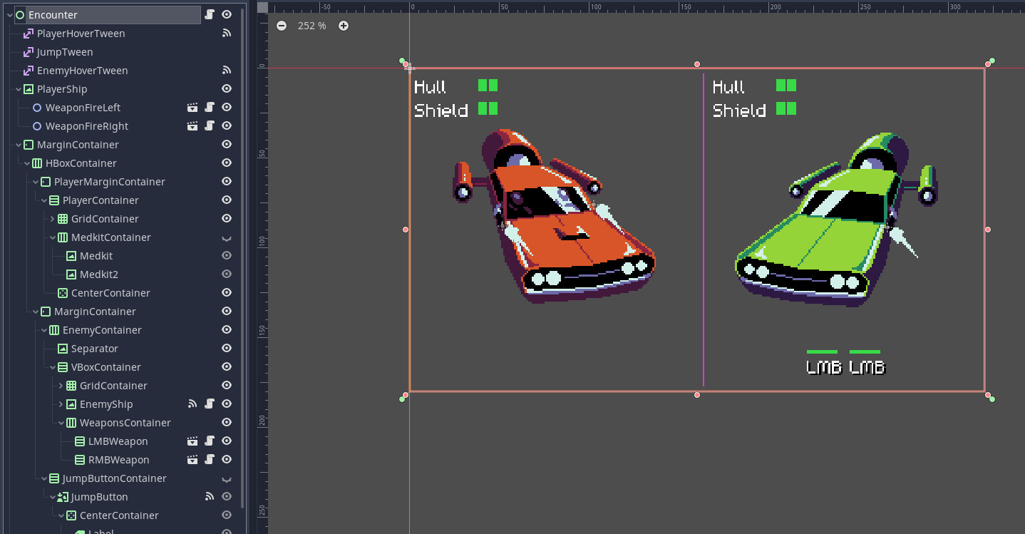 Implementing the combat was a lot tougher. The battle scene is almost entirely UI nodes, which was perhaps a mistake, and for some reason I struggled most of day two to even get player input to register properly. I don't really remember now what the obstacle was to this - maybe I was just tired.