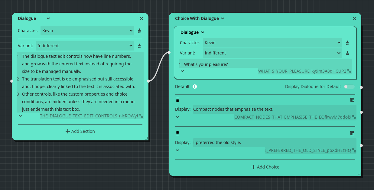 3. Similarly, it was kind of a pain scrolling up and down a node when there was a long section of text. I have since partially implemented a mechanism to allow the dialogue node to be "maximised" when you want to focus on editing, and I will be doing the same for the choice node.