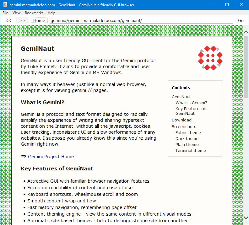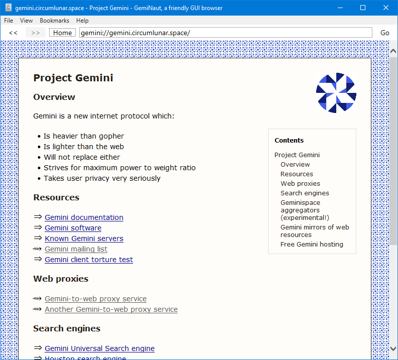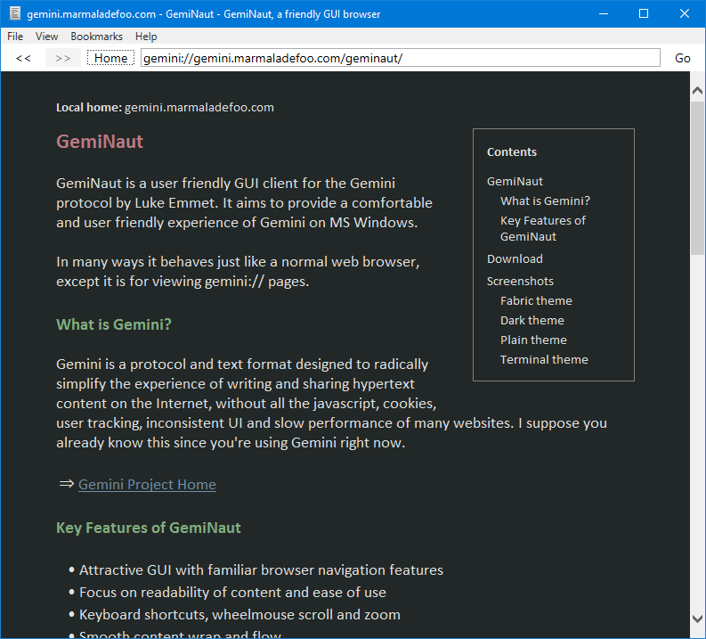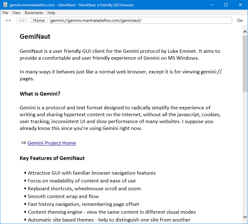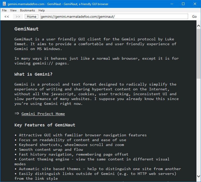 GemiNaut is a user friendly GUI client for the Gemini protocol by Luke Emmet. It aims to provide a comfortable and user friendly experience of Gemini on MS Windows.