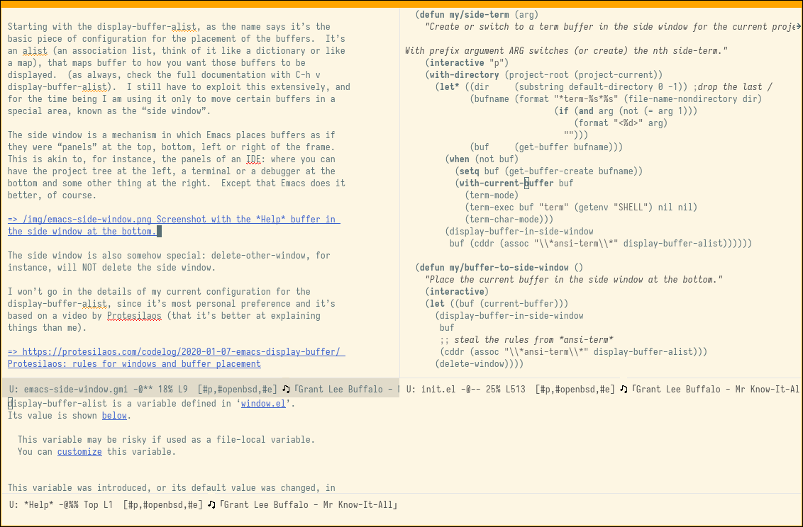 I won’t go in the details of my current configuration for the display-buffer-alist, since it’s most personal preference and it’s based on a video by Protesilaos (that it’s better at explaining things than me).