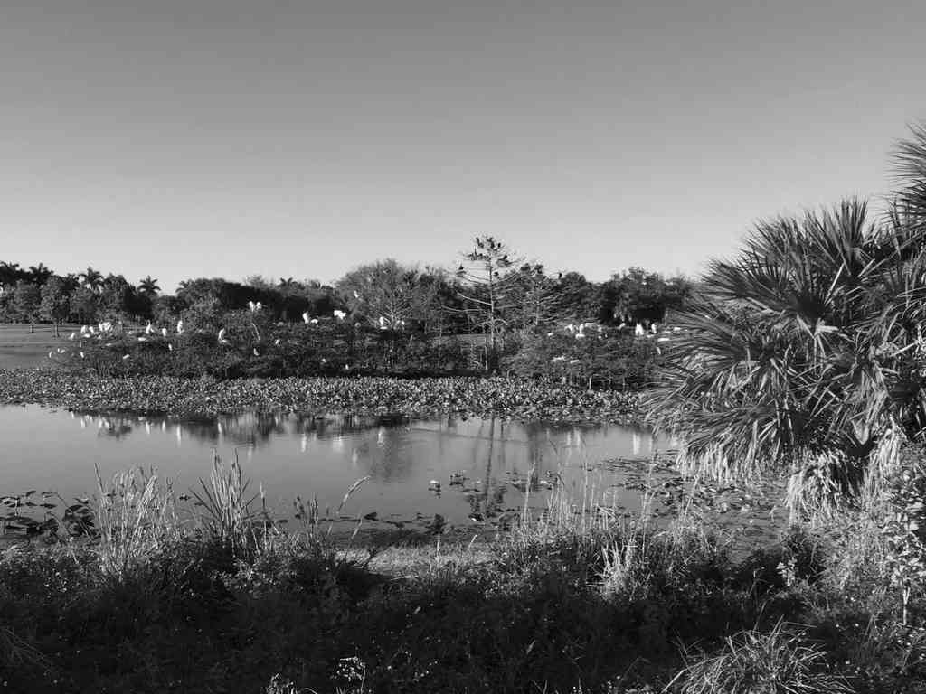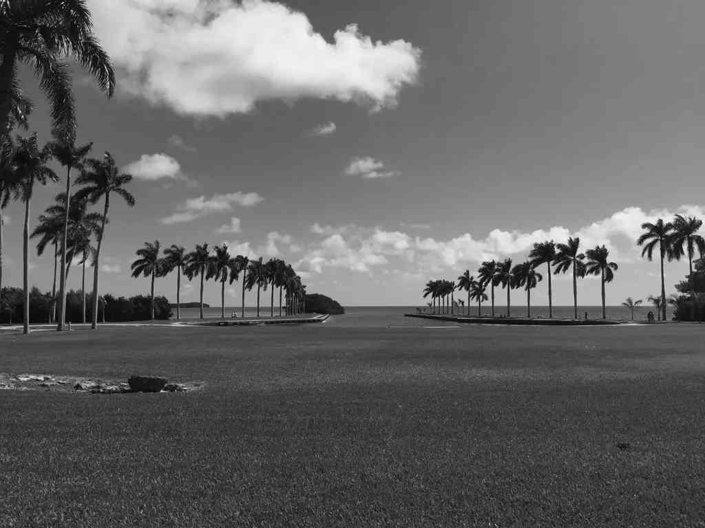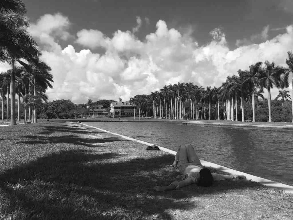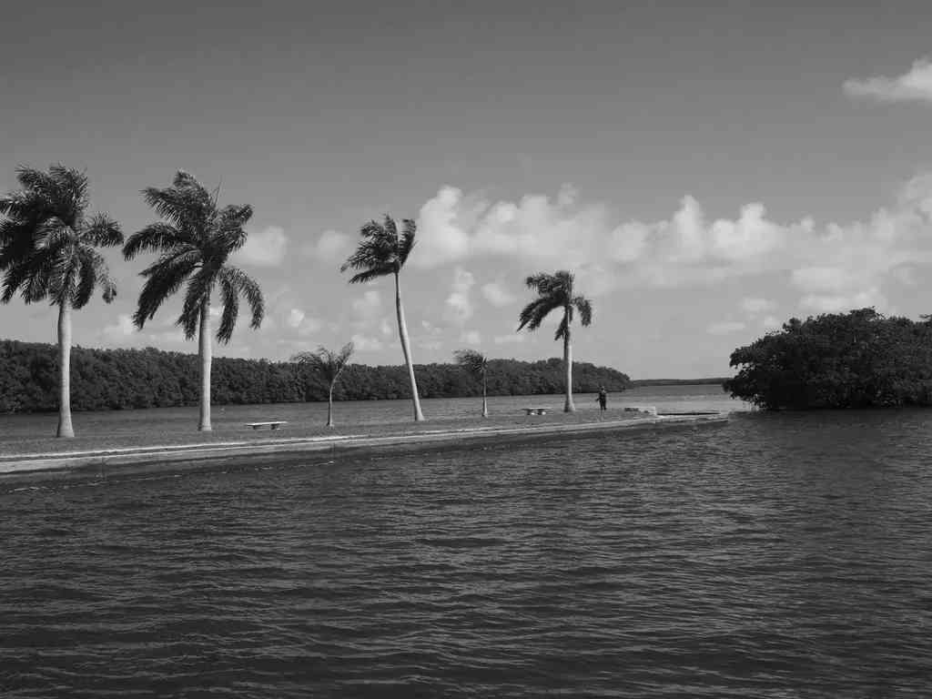 Jardin de mangroves et de palmiers au bord de l’Océan. La végétation chapeautée par les nuages trace une ligne montagneuse. Le bleu, le vert, l’eau boueuse dans un recoin de canal où jouent des lamantins. Un Deering a construit à Miami le palais kitsch de Vizcaya, son frère un jardin moderniste d’une sobriété impeccable. Aucune envie d’entrer dans les maisons pourtant parfaitement situées en retrait de la pelouse. Je sens toujours la mort dans ces intérieurs.