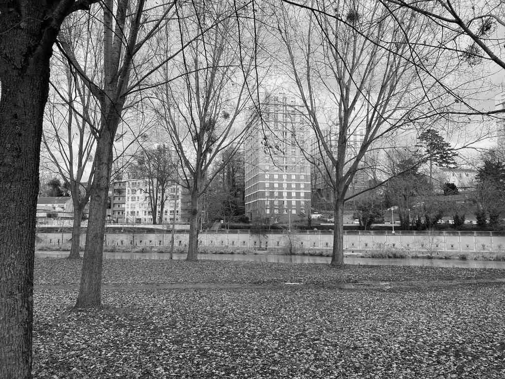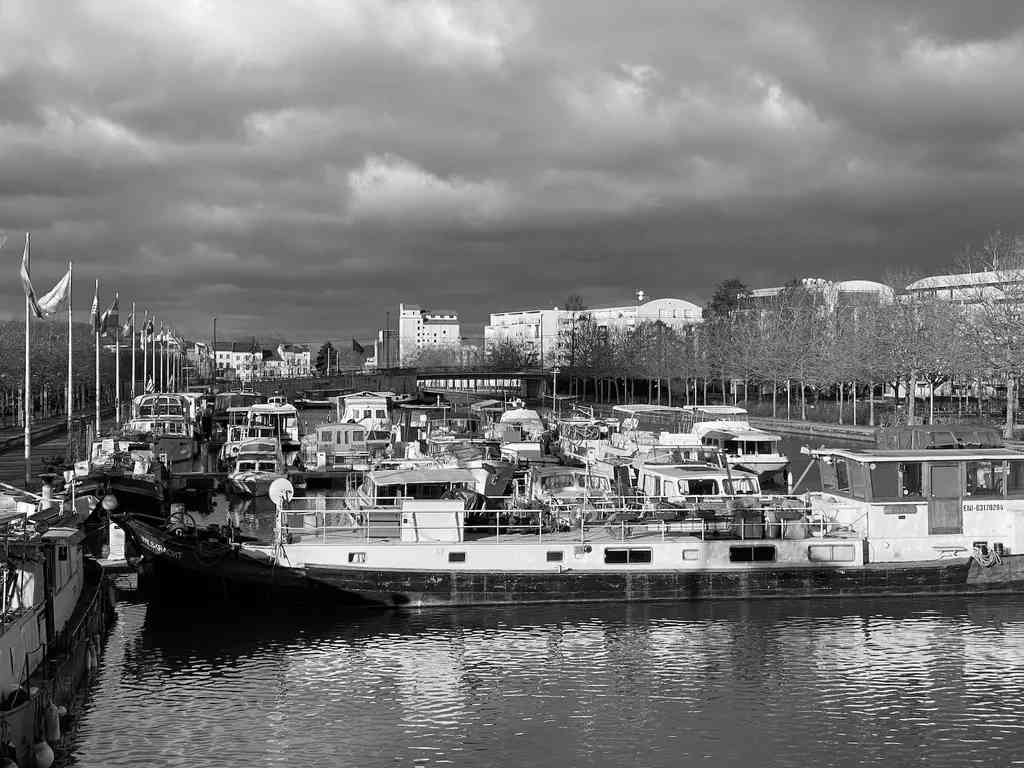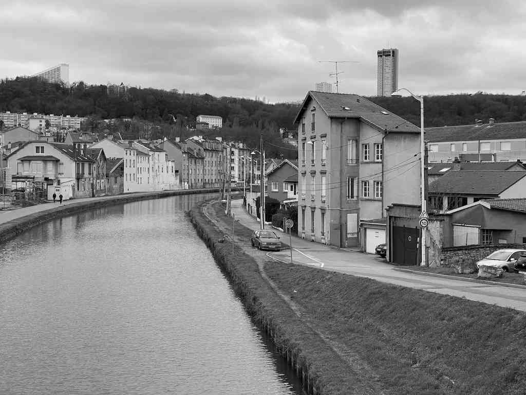 Mulhouse, une ville parce qu’il faut bien vivre, une ville avec sa place centrale, son monument, ses rues commerçantes avec les mêmes commerces que partout ailleurs, des maisons avec portes et fenêtres, des rues minérales, froides, grises malgré le soleil éclatant, mais trop bas pour percer le sol, réchauffer les bâtiments qui se veulent bourgeois à moindres frais, qui n’attrapent pas l’œil, qui ordonnent de m’éloigner de ce centre sans autre raison d’être que géométrique. Je me dirige vers le canal aperçu hier, traverse une cité vaguement turinoise, avec immeubles rouges à arcades, disposés autour d’une place triangulaire et verdoyante, un semblant de recherche, de lumière. Un peu plus loin, je rejoins le canal et découvre qu’il s’agit du canal du Rhône au Rhin, un canal qui donc mène jusqu’à ma maison. Me voilà reconnecté à mes racines par un filament de molécules de H2O, et sans doute une très faible déclivité. Mulhouse souffre de sa platitude, tout juste si remontant le canal, j’aperçois une vague colline grise. L’herbe est blanche de givre, les flaques gelées, je tente de m’asseoir sur un banc et me trempe les fesses. Je repars boitillant, ma jambe droite rétive. Elle fonctionne à merveille à vélo, mais me chagrine à pied, mon genou étant très douloureux en ce moment, comme si mon fémur lui imposait des tensions que lui-même ne supporte plus.