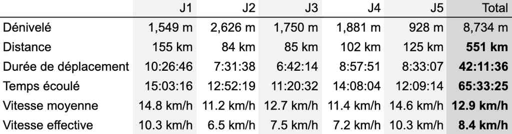Lors de notre tour d’avril, nos vitesses effective et moyenne étaient 1 km/h supérieures, ce qui explique pourquoi je termine moins fatigué, cette fois.