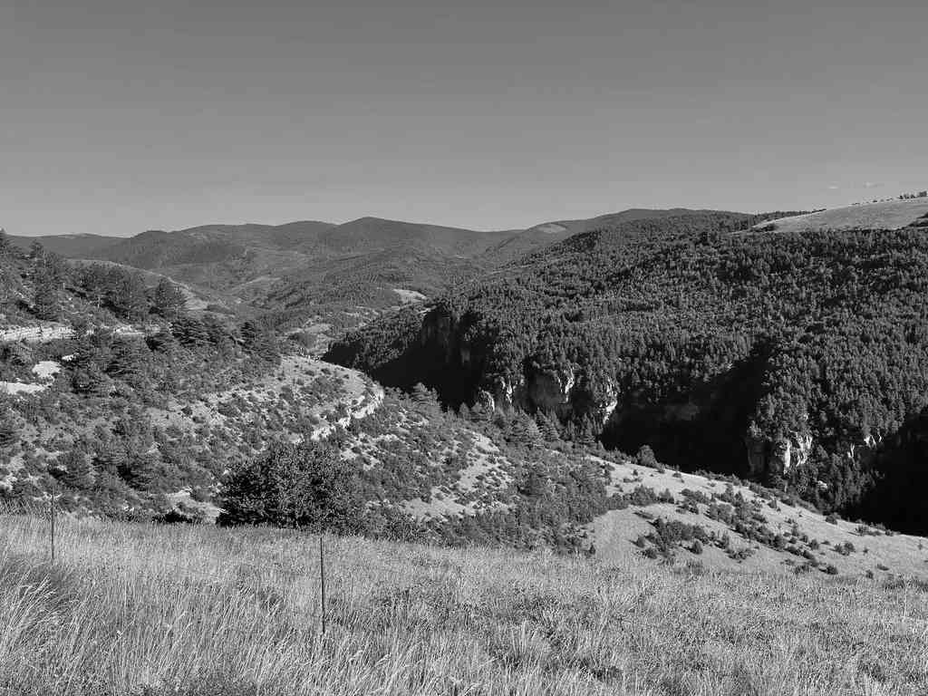 Nous traînons une bonne heure, avant d’attaquer l’escalade du causse du Larzac. De l’autre côté des gorges de La Dourbie, sur le causse Noir, se dressent les totems calcaires du chaos de Montpellier-le-Vieux. Les intempéries ont rongé tout autour les calcaires plus tendres, ne laissant que les vestiges de building d’un autre temps.
