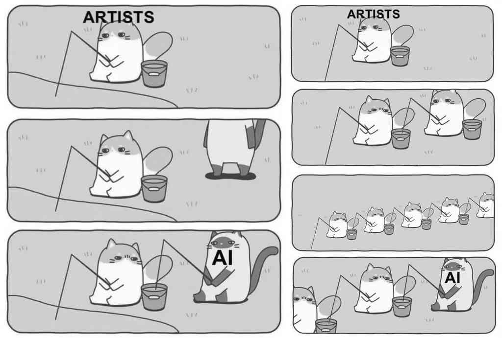 Un artiste pêche et met ses poissons dans un sceau. Une IA arrive et vient pêcher dans son sceau. Cette illustration exprime ce que la plupart des gens pensent. Mais un commentateur joue avec l’image. À la place d’une IA, un deuxième artiste arrive qui pêche dans le sceau du premier, puis un troisième, et ainsi de suite, avant qu’éventuellement une IA arrive et ne fasse pas autre chose. La seule différence : elle est plus rapide, infatigable. C’est ça qui fiche la trouille à beaucoup, alors que ça m’ébouriffe le cerveau. Une autre illustration postée sur le fil montre des artistes pêchant dans les sceaux d’IA qui elles-mêmes pêchent dans ceux des artistes. Nous vivons un brassage extraordinaire ou les limites de qui fait quoi se brouillent. Nous devrions nous en réjouir. Mettre notre ego de côté. Prendre tout cela, le démultiplier avec passion. Je vois surgir des arguments religieux pour défendre l’artiste qui irait chercher son inspiration auprès du divin. Il y a une grande trouille chez beaucoup de gens. Utiliser les IA comme nous sommes des millions à le faire devient presque une provocation.