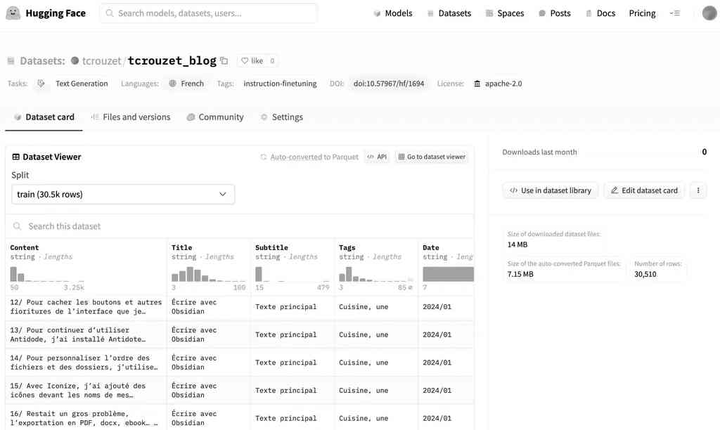 Le dataset serait la version contemporaine de l’abécédaire. Nous ne sommes sans doute pas tout à fait prêts à les écrire consciemment, mais nous pouvons tout au moins en générer automatiquement. Je me suis donc amusé à créer un dataset avec le contenu de mon blog que j’ai publié sur Hugging Face. Les créateurs de LLMs peuvent l’utiliser pour entraîner leurs modèles. J’ai bien tenté d’entraîner Mistal sur mes textes, mais j’ai mis à genoux mon Mac.