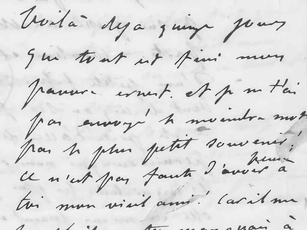 C’est une chose étrange avec toi combien j’écris mal, je n’y mets pas de vanité littéraire. Mais c’est ainsi, tout se heurte dans mes lettres. C’est comme si je voulais dire trois mots à la fois. […] C’est en t’écrivant que j’étrenne ce fauteuil sur lequel je suis destiné, si je vis, à passer de longues années. Qu’y écrirai-je ? Dieu le sait. Sera-ce du bon ou du mauvais, du tendre ou de l’érotique, du triste ou du gai ? – De tout cela un peu, probablement, et rien en somme. N’importe, que cette inauguration bénisse tous mes travaux futurs !