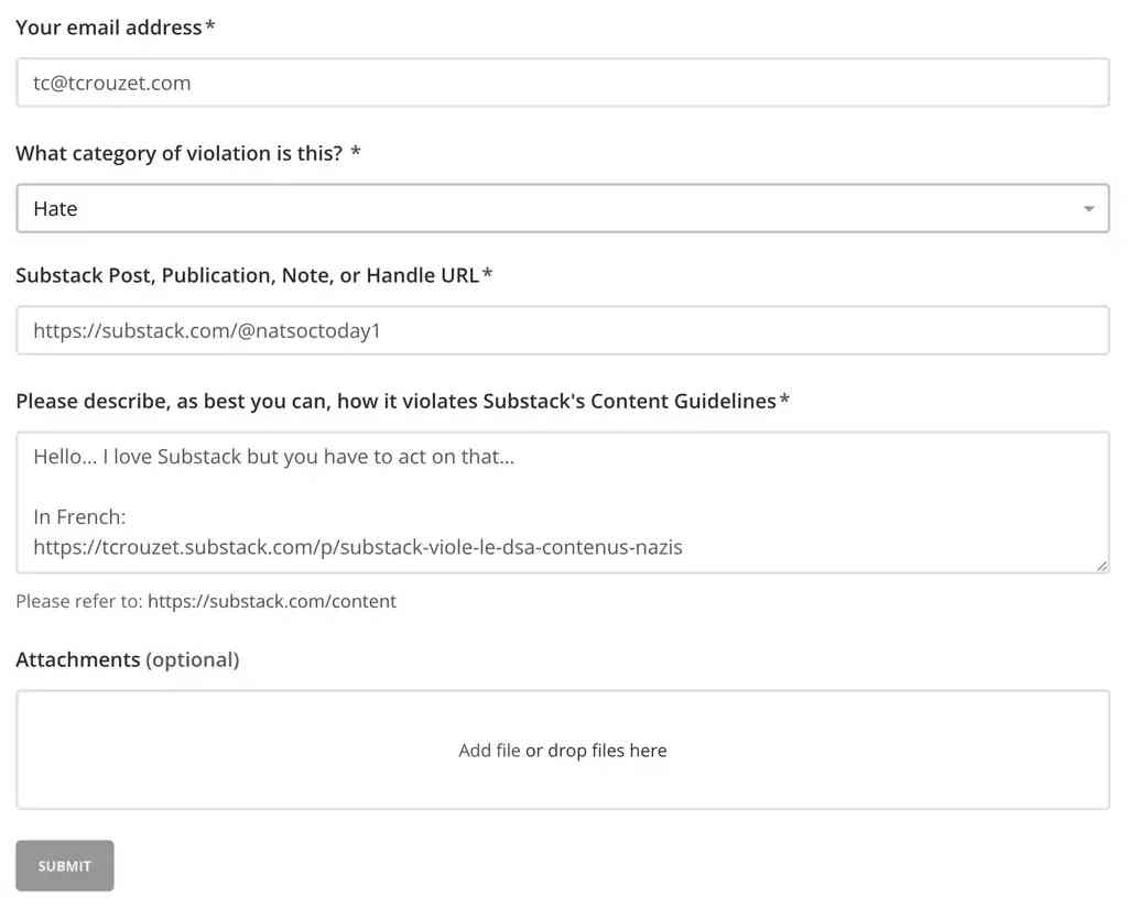 Dès janvier 2024, il alerte comme beaucoup d’autres sur les contenus nazis disponibles sur Substack et comme beaucoup d’autres leur suppression le rassurent. Mais durant l’été 2025, deux événements le décident à quitter : le push par Substack de la lettre nazie et le blocage d’une photo illustrant le génocide palestinien.