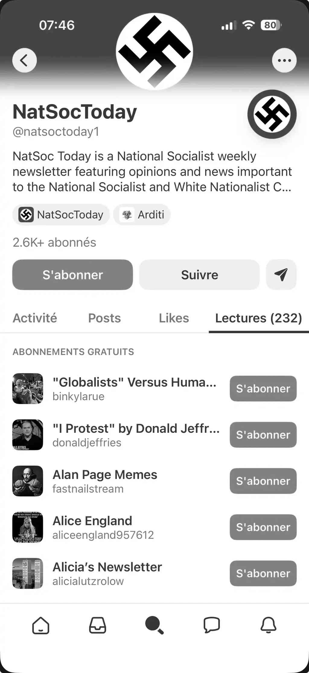 Dans la foulée, Sidoine me pointe vers une résurgence de contenus nazis sur Substack en juillet 2025 (Gizmodo : Substack Sends Push Alert for Nazi Newsletter). Soit-disant par erreur, Substack a incité certains abonnés de consulter une newsletter pronazie. Cette affaire a poussé de nouveaux auteurs à quitter Substack pour Ghost. David Farrier explique sa démarche dans An August AMA! et Some More Thoughts on Substack.