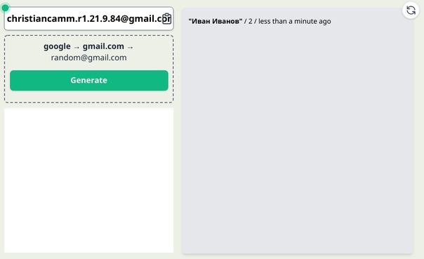 2) Откроется временный почтовый ящик домена GMail. Для того, чтобы заменить почту, нажмите на кнопку "Generate".