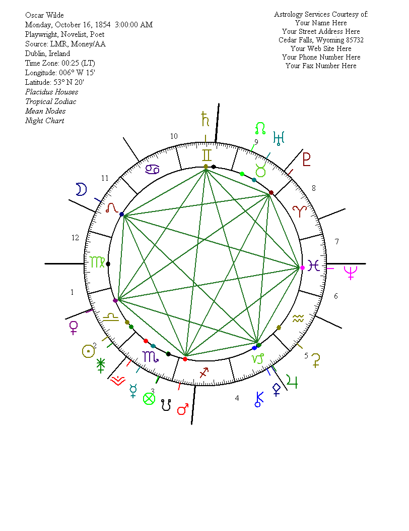 The 21st or 22nd of Jan might be another good date because the sun will just be entering aquarius, which is another point for the pattern in my chart. I'd have six points of the full seven filled. The empty seventh point is at about 10deg sagittarius. My natal neptune is at 13deg sagittarius, but it's too large an orb to count, really. Someone tried to suggest that Oscar Wilde had a grand septile, which sounds cool but it's not true, the orbs are laughable. Look how warped this thing is.