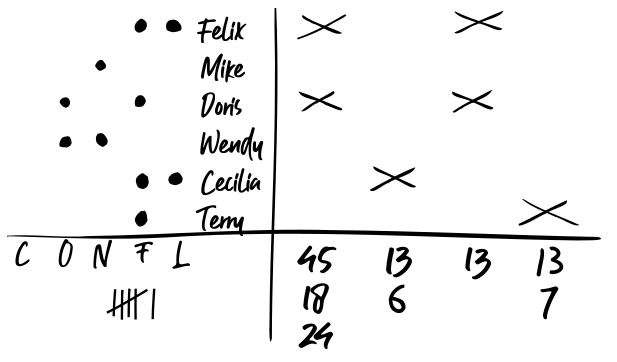 In the example, the order is Wendy, Doris, Mike, Felix, Cecilia, then Terry. This complex situation has gradually built over six rounds.
