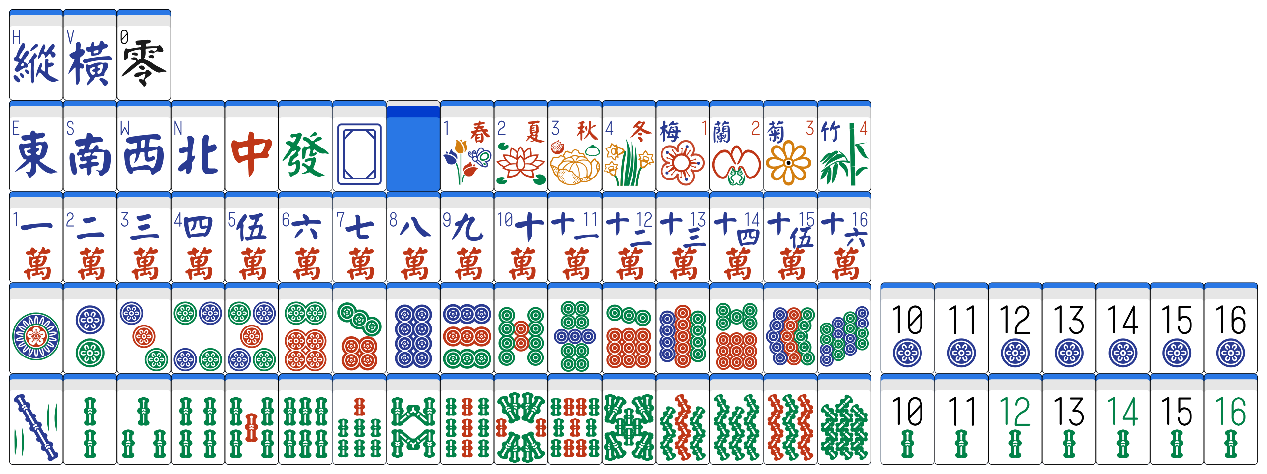 Number tiles use two characters. The first character represents the rank. Use 1 ~ 9, then x, then a ~ f for 1 to 16. The second character is the suit:
