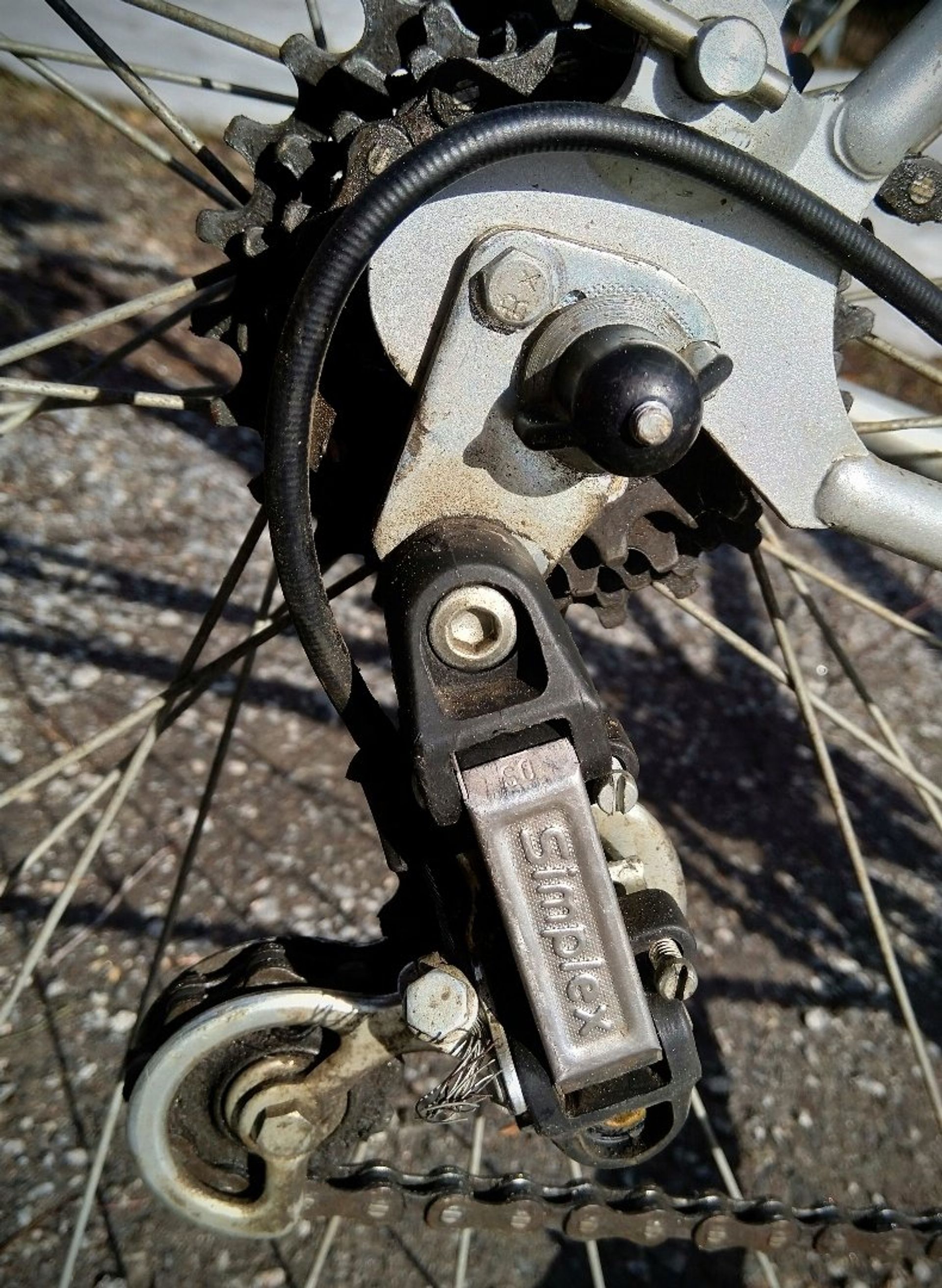 The bike is in pretty good condition! Paint still looks good and there are only a few rusty spots in the frame. It's got Simplex derailleurs (2x5) with the dreaded plastic parts. The rear derailleur works surprisingly well, the front not so much.