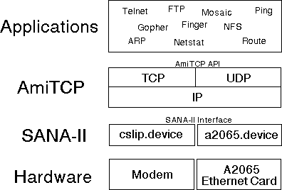 This layering is illustrated in Figure 1. Applications are built using AmiTCP's API (Application Programmers Interface) and don't care what goes on beneath them. Similarly, AmiTCP doesn't care what kind of hardware it's using, it just talks to the SANA-II interface of the device you specify. The SANA-II devices talk almost directly to the devices they abstract.