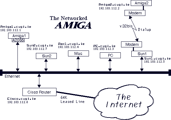 In an attempt to help you understand the kind of information you need before you set up AmiTCP and indeed to just give you an overall picture of what we're talking about, here's a not-so-contrived example of a hypothetical network.