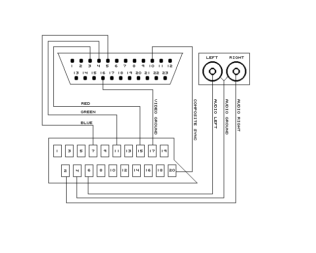 SCART Side Pin Pin AMIGA Side ---------- --- --- ---------- Red Signal In 15 3 Analog Red (75 Ohm) Green Signal In 11 4 Analog Green (75 Ohm) Blue Signal In 7 5 Analog Blue (75 Ohm) Composite Video In (75 Ohm) 20 10 Composite Sync (47 Ohm) Composite Video Output Common 17 16 Video Ground Audio In Left Channel 6 - Left Phono Audio In Right Channel 2 - Right Phono Audio Ground 4 - Left + Right Phono