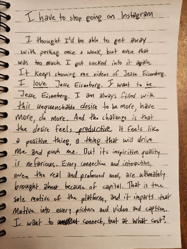 I want to decrease my productivity. I want to do things slower and worse. I want to type out every single letter when I'm communicating with another human being. I want to spend a stupid amount of time crafting the exact sentence I want because it's what I want to say. I don't want it to be fast. I don't want it to be optimized. I want it to be personal. I want it to be imperfect. I want to make mistakes. I want the work to be about the work itself. I want to work for the sake of work, not some larger purpose. I want to live entirely within the confines of this one moment, this one gift I have been given.
