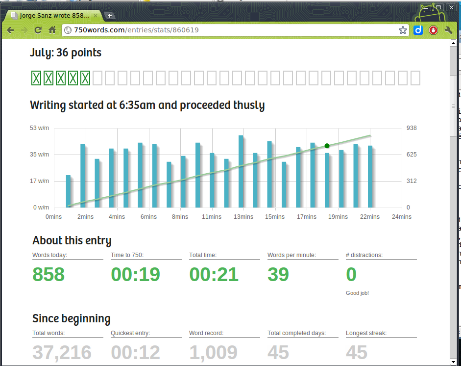Bueno es la tarde/noche, he pegado el texto de arriba de 750words.com corrigiendo alguna faltita. Por cierto era mi día 45, no 44. Os dejo un par de pantallazos de la interfaz de escritura (se puede personalizar un poco) y de la primera parte de las estadísticas que hace la web de una entrada diaria. En realidad saca muchas más estadísticas, pero sólo son útiles si escribes en inglés, que salvo los días que estuve en Nottingham (por aquello de la inmersión lingüística y tal) pues no es el caso.
