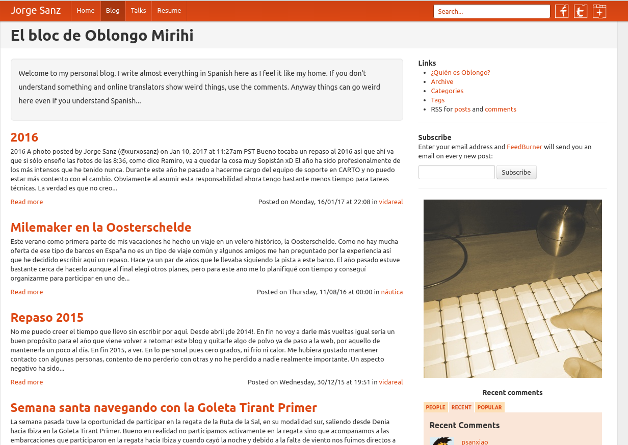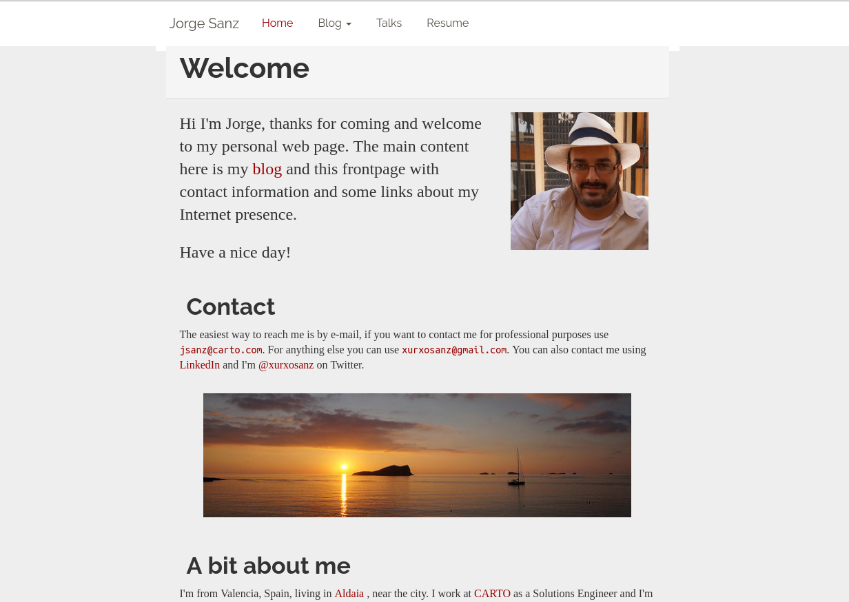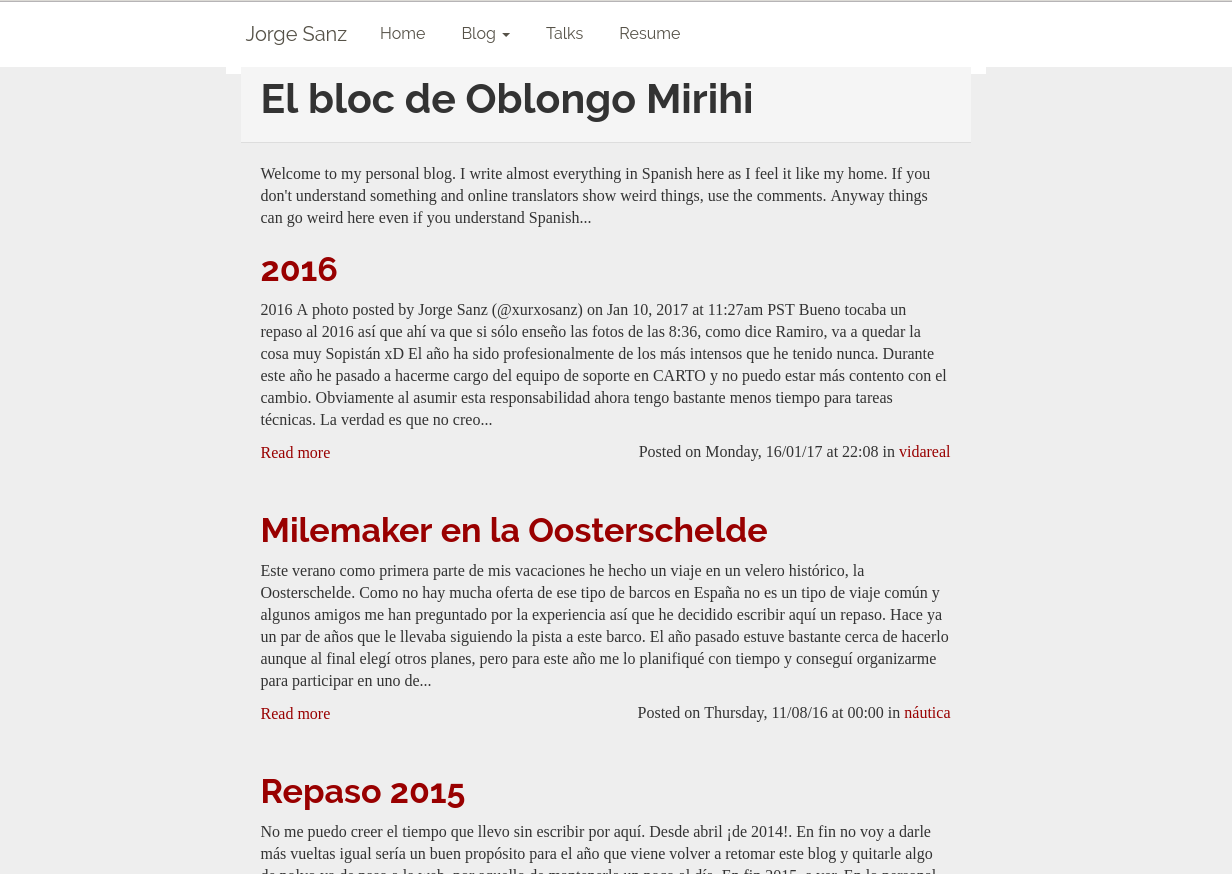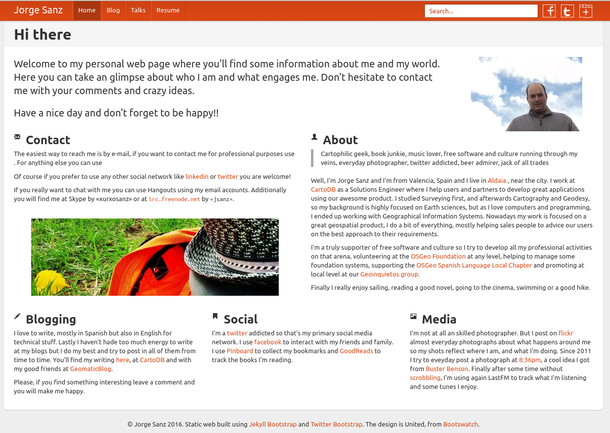 One of my objectives for this year was to update my website design. I haven't spent a lot of time on this, just a couple nights after dinner, in short I switched the Bootswatch[1] theme from United[2] to Readable[3] and then tweaked some colors and distances on the CSS, removed a bunch of unused things and finally gave to the frontpage a good review and simplification.