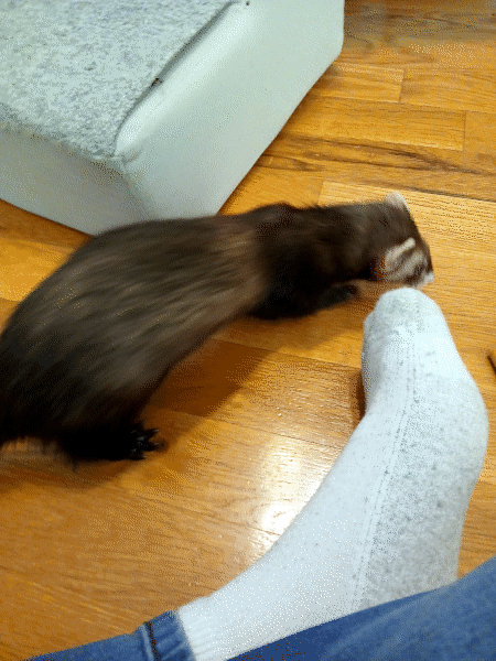 Our ferrets Mocha and Chai love to play, but their sleep schedules are slightly different. That means they usually play alone--and they want us to join them. We don't have the free time to do that during the day. So this week we decided to buy a third ferret, one who can be a playmate to the other two. She is very young--and fast, as this blurry picture shows.
