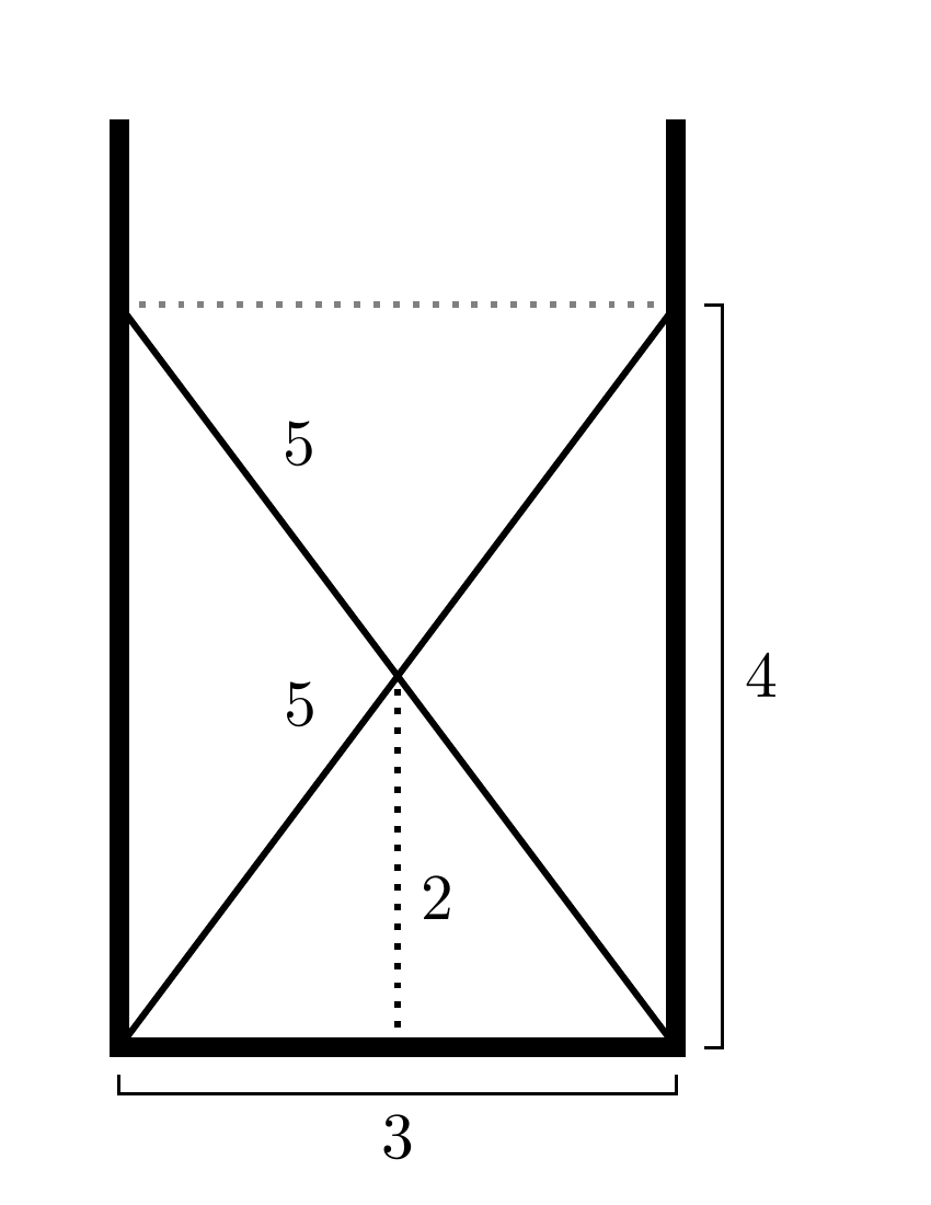 Certain cases are easy to determine. For example, if m=n, the answer is clearly yes. Ladders of equal length rise the same height from the ground, and they cross at their midpoints. This arrangement forms a rectangle with width w and height ν=2h. It immediately follows that h and w are integral if and only if (w,ν,n) is a Pythagorean triple (which may or may not be primitive) and ν is even.
