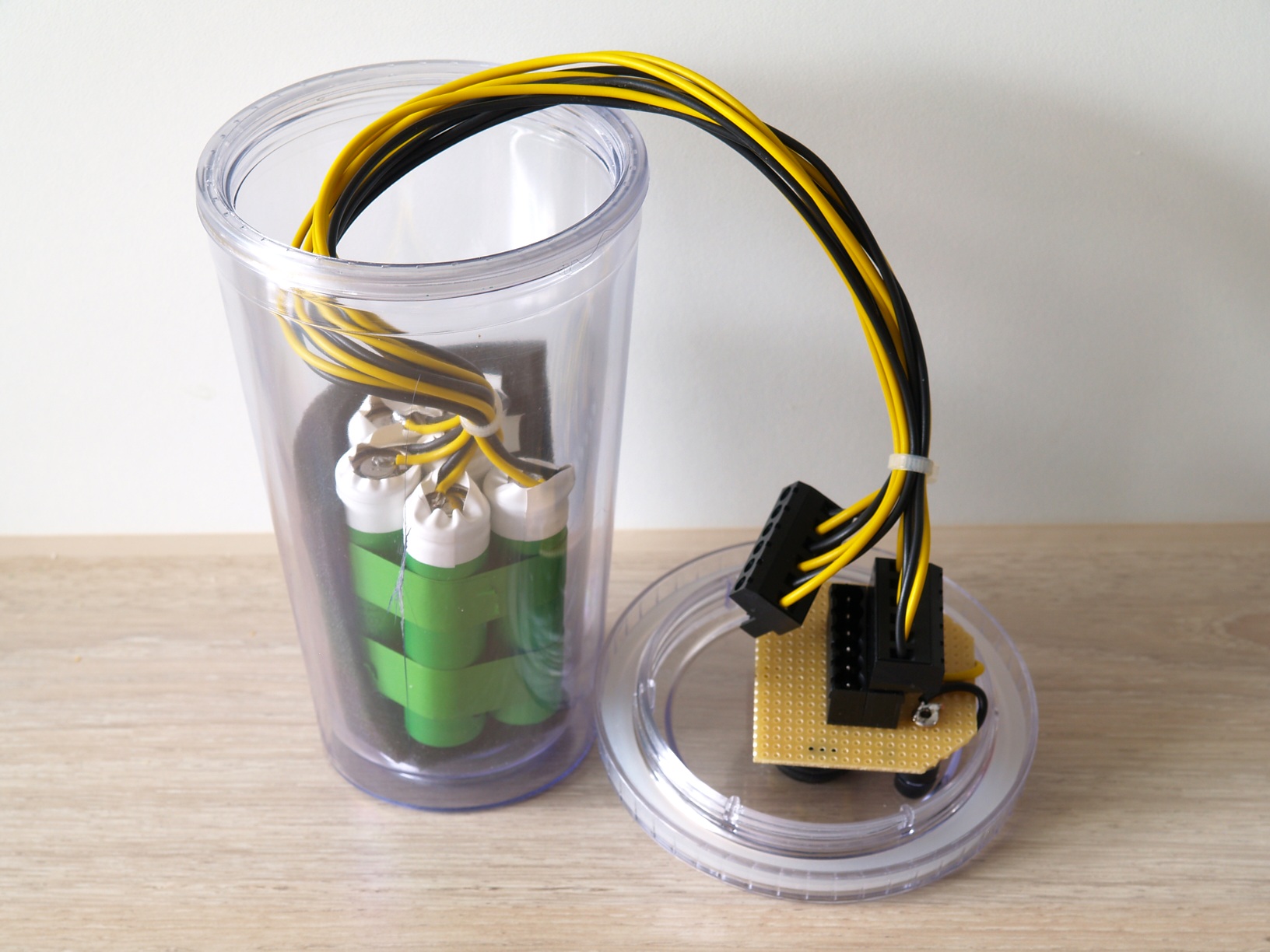 Der Akku ist wie gesagt aus 6 Sony US18650GR aus einem Laptop-Akku zusammengebastelt. An jede Zelle habe ich direkt zwei Strippen angelötet (Vorsicht, Explosionsgefahr!) und alles auf zwei solide Steckverbinder geführt. Damit habe ich die Möglichkeit, jede Zelle separat zu laden bzw. einen Balancer anzuschließen. Die Stecker sind jederzeit gut zugänglich, da der ganze Kram in einem Trinkbecher mit abgedichtetem, schraubbarem Deckel sitzt. Damit ist auch gleich die Wasserdichtigkeit gegeben. Ein weiteres Plus ist, dass es sich bei meinem Becher um einen Doppelwandigen handelt. Damit sind die Zellen gleich noch vor kalten Außentemperaturen geschützt. Allerdings muss ich den wohl noch mit Farbe oder Papier auslegen, weil das ganze Konstrukt auf den ersten Blick doch ziemlich wie ein IED aussieht ;).