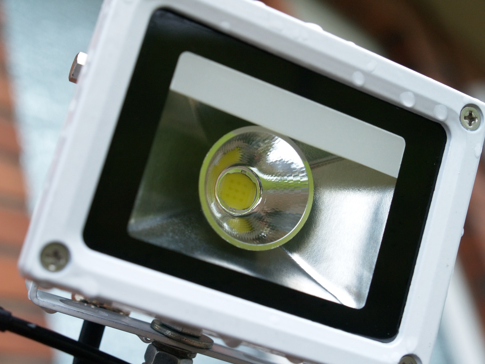 Kurzzeitig fiel meine Aufmerksamkeit dann auf LED-Spots von Osram und Philips. Die machten schon ein ordentliches Licht; zwei Stück davon und gut is', aber leider waren auch die nicht ohne weiteres wetterfest. Die Richtung war allerdings nicht schlecht, bin ich doch schließlich bei einem LED-Strahler für den Außenbereich gelandet. Die Teile gibt es teilweise schon für unter 20 Euro zu holen und man hat einen 10W-Emitter inklusive wetterfestem Gehäuse! Die perfekte Ausgangssituation also. Ein Reflektor ist wohl auch mit dabei, aber das Strahlenprofil ist für den Alltag nicht wirklich zu gebrauchen. Für den Offroad-Gebrauch über unbeleuchtete Waldwege allerdings sind die 120° perfekt.