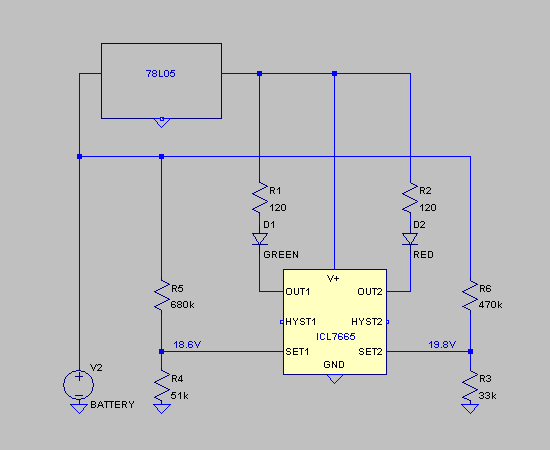 Bis jetzt ist noch kein Schutz gegen Tiefentladung vorhanden, der allerdings zwingend notwendig ist, da der Wandler auch mit 12V noch arbeiten sollte, wenn der Akku schon längst total platt ist. Hier ist eine einfache Schaltung mit zwei LEDs, die ich noch in den Akku mit einbauen werde. Bei voller Ladung leuchtet nur die grüne LED. Ab einer Akkuspannung von ca. 19.8V (oder 3.3V pro Zelle) leuchtet zusätzlich noch die Rote. Bei einer Zweifarb-LED also Orange. Ab 18.6V (3.1V pro Zelle) leuchtet dann nur noch die Rote, und man sollte langsam ans Ausschalten denken, bevor es an die Gesundheit der Batterie geht. Letztlich sind Lithiumzellen auch nur Menschen, die werden auch zur Diva wenn sie hungrig sind 8)!