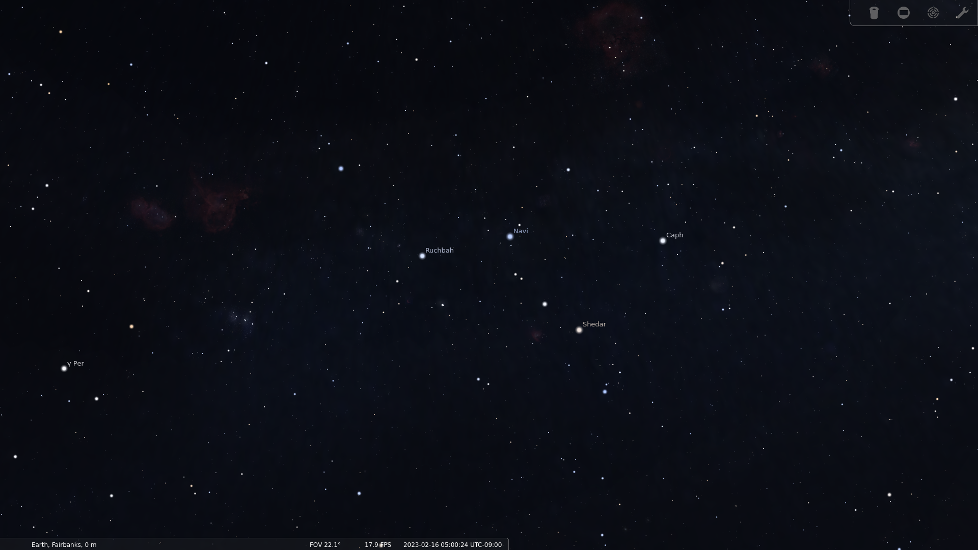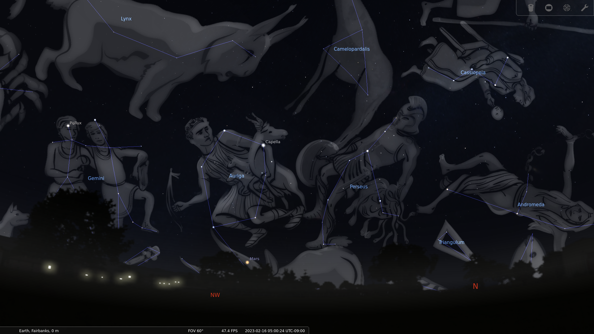 With the aurora going on, even making it somewhat difficult to see the stars, I decided to not use the telescope, but do mainly naked eye stargazing. I played around with the binocs, but it was so cold that it was difficult to use them much. Temps dropped down to -22 deg F by the time I left, around 5:30am. I did, however, have a decent view of constellations to the north and to the west, and have a pretty good memory of Gemini, Auriga, Perseus, and Cassiopia:
