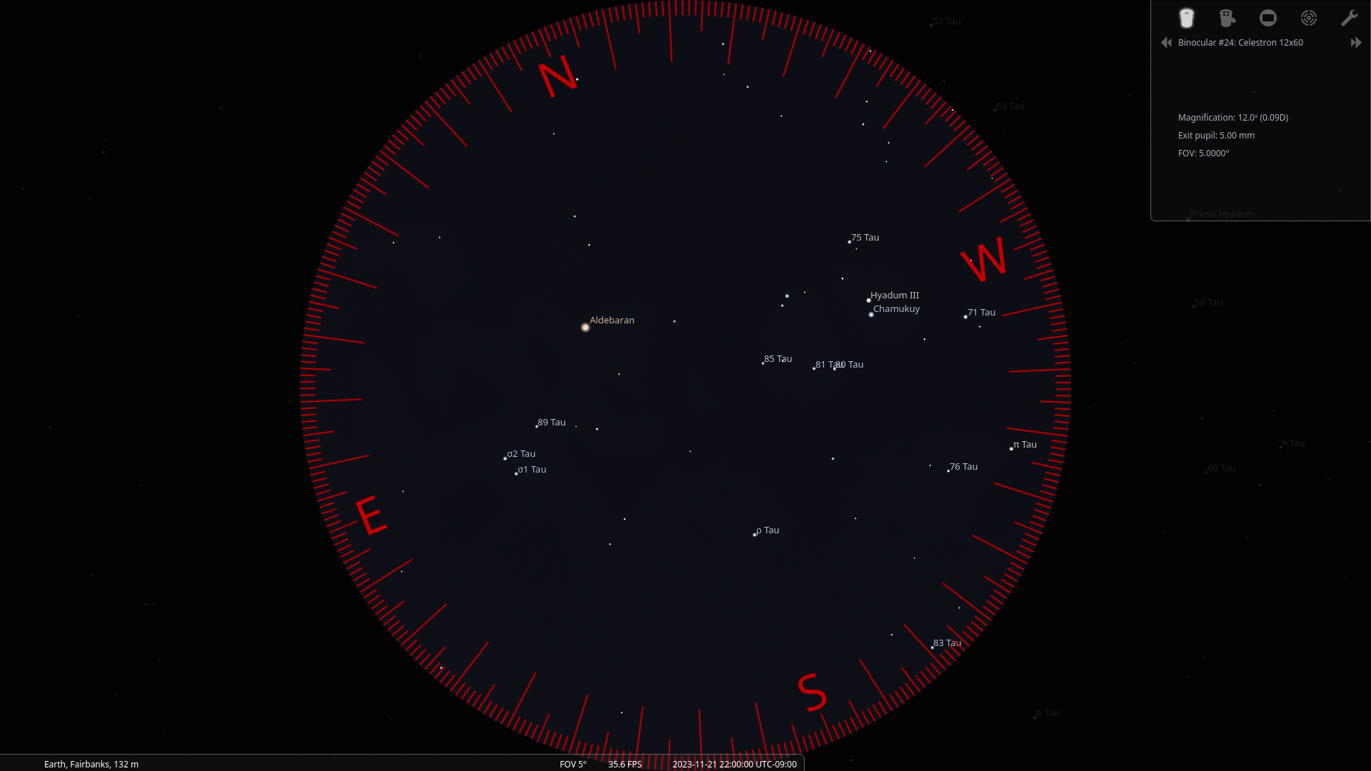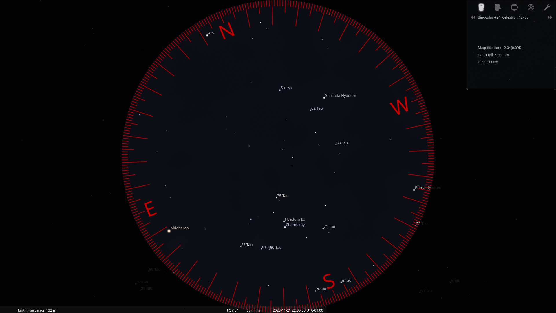 The sky was very bright, due to the bright, high quarter-moon to toward the south, and the city lights to the east. But in between the two areas of sky, there was a slighty darker patch, with Taurus nicely positioned for binocular viewing, so I decided to focus on that: