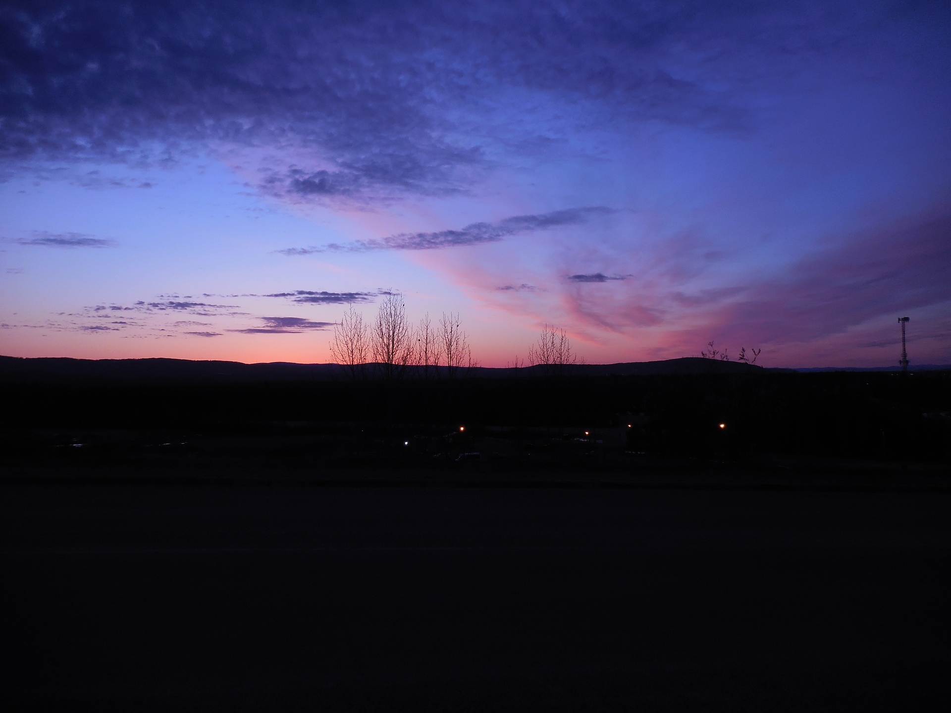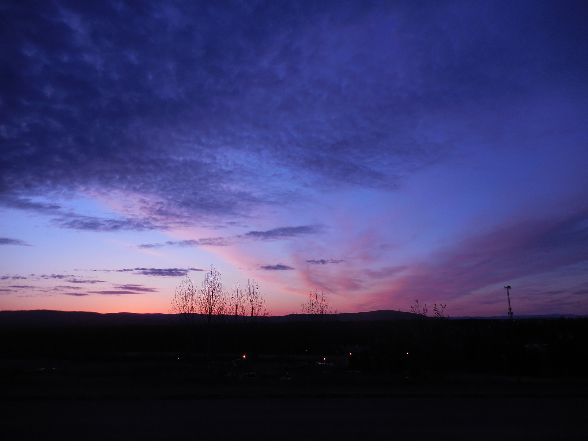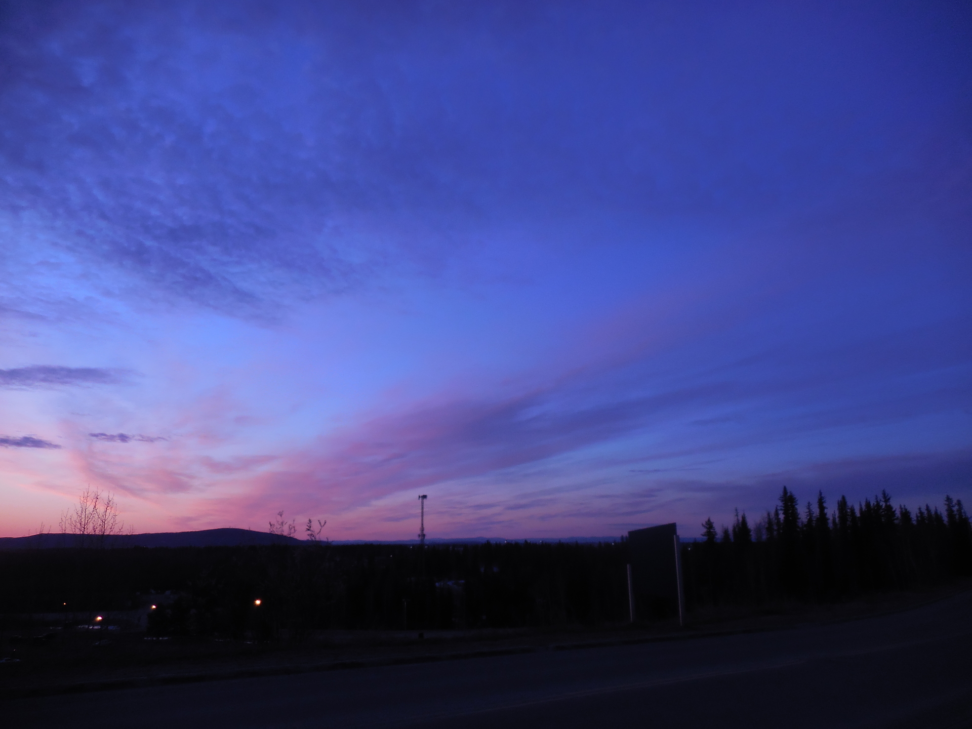 I was blessed this morning with an opportunity to watch the sunrise this morning, for about the first 45 minutes after 5am AKDT. The cloud cover was ideal — not too thick but not too thin. I used a parking lot on the east side of the UAF hill. Unfortunately, there are some hills to east and northeast blocking the horizon, but there aren't many ideal locations to chose from in Fairbanks. I think this photo best captures the experience: