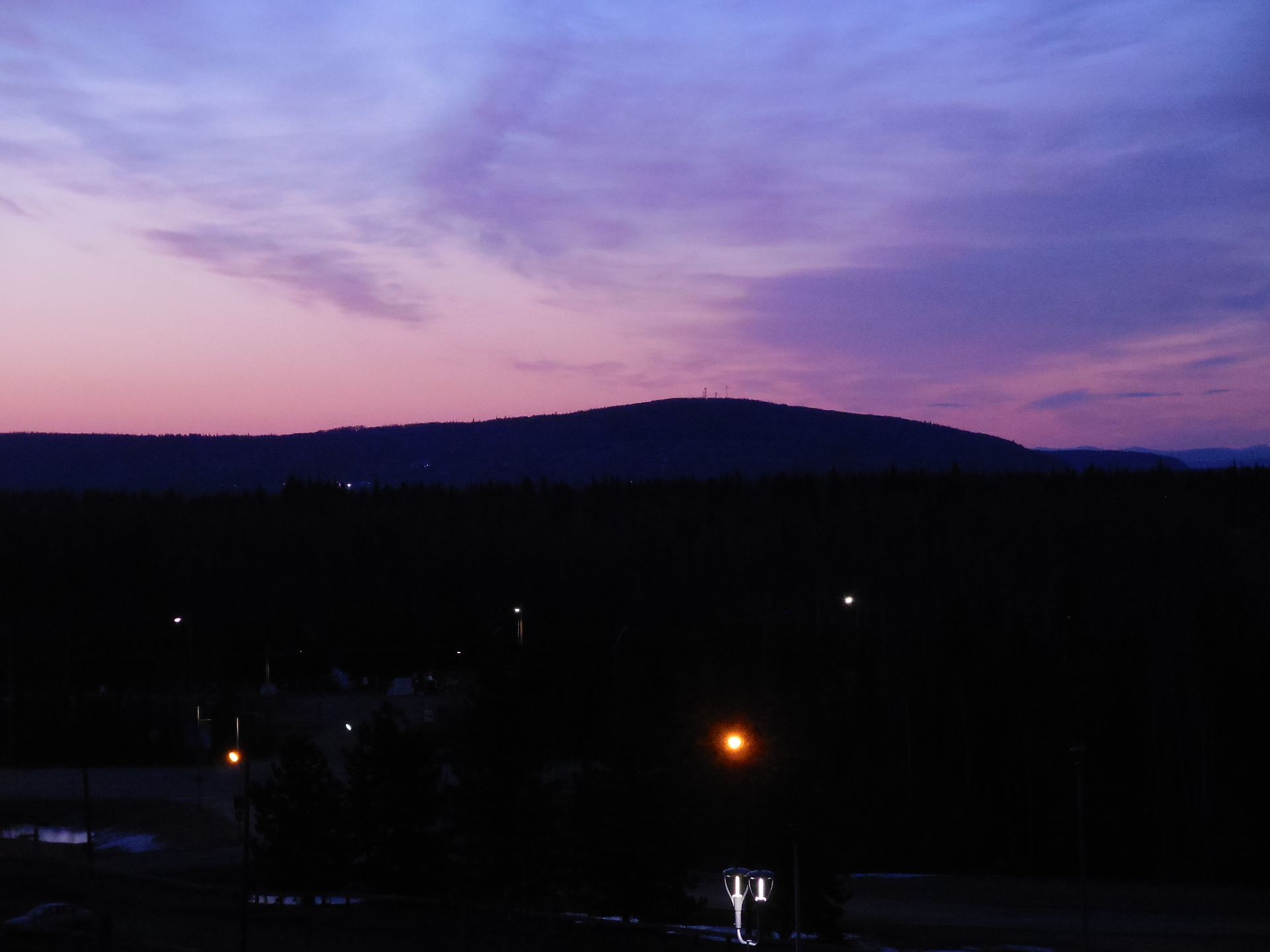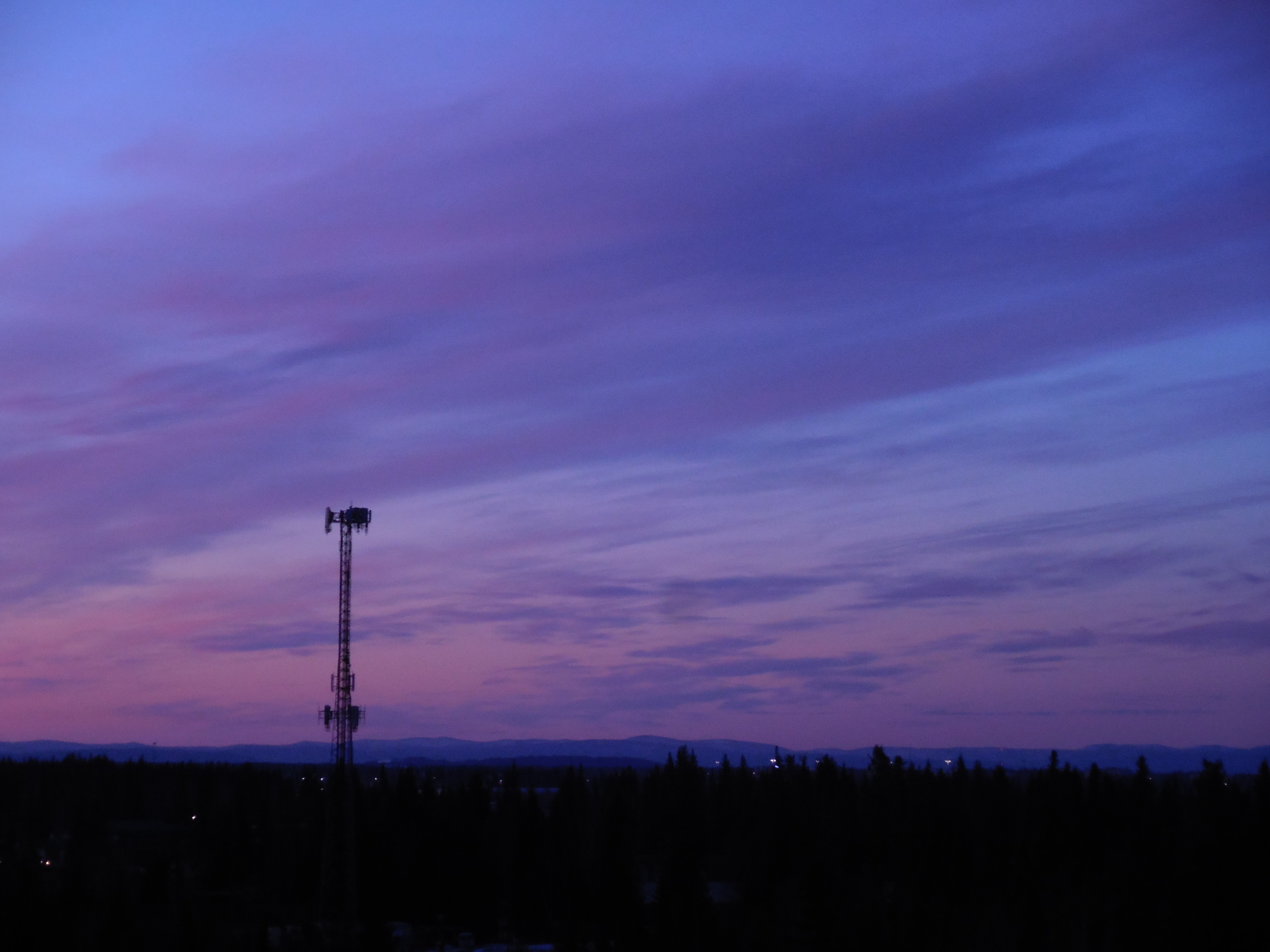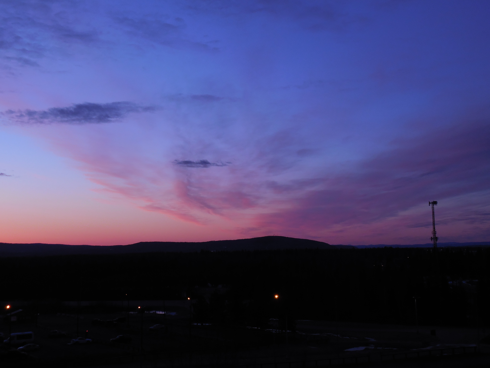 I was blessed this morning with an opportunity to watch the sunrise this morning, for about the first 45 minutes after 5am AKDT. The cloud cover was ideal — not too thick but not too thin. I used a parking lot on the east side of the UAF hill. Unfortunately, there are some hills to east and northeast blocking the horizon, but there aren't many ideal locations to chose from in Fairbanks. I think this photo best captures the experience: