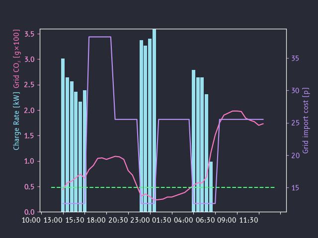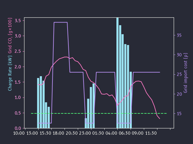 Here are some recent examples, the charge rate is shown with the blue bars using a scale of kW, the grid CO₂ intensity is the pink line using a scale of grams per kWh (times 100), the purple line shows the cost to import from the grid in pence, and the dashed green line is the "threshold cost" which is used to determine when to enable charging.