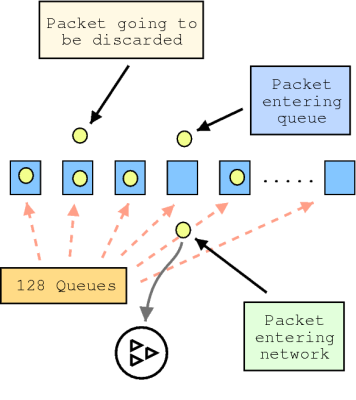 Η επιλογή του επόμενου πακέτου προς αποστολή γίνεται με κυκλικό τρόπο (Round-Robin), επιλέγοντας ένα πακέτο από την επόμενη στοίβα κάθε φορά. Με τον τρόπο αυτό, τα flows τα οποία παρουσιάζουν κίνηση μπορούν να δημιουργήσουν 128 φορές μικρότερο πρόβλημα στο δίκτυο.