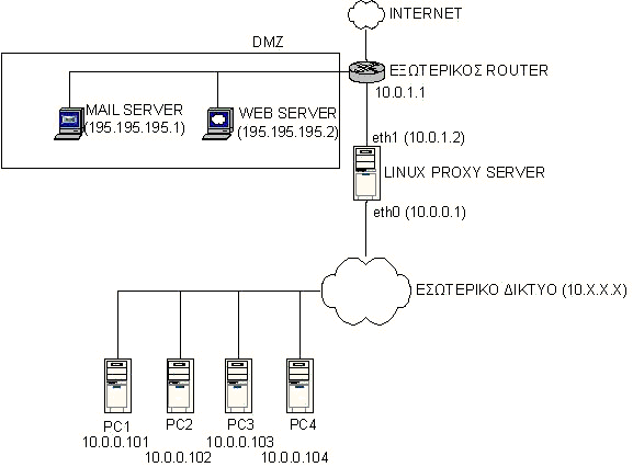 PROXY SERVER: Ο proxy server του δικτύου μας, με τον οποίο θα ασχοληθούμε. Προσέξτε ότι έχει δύο κάρτες δικτύου, μία για κάθε δίκτυο που συνδέεται.