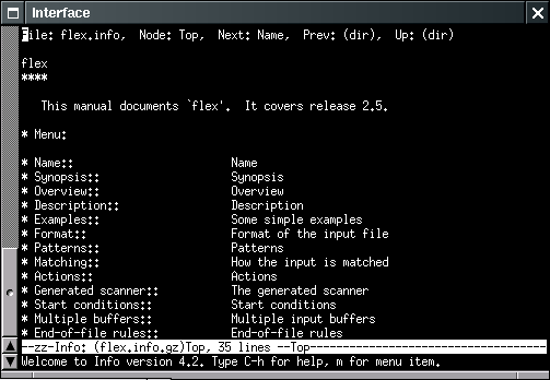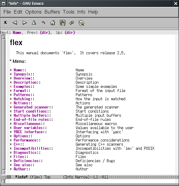 Αρχικά μπορείτε να ανοίξετε ένα τερματικό στο pc σας και να δώσετε "info flex" [εικόνα][1]. Πατώντας το πλήκτρο space μπορείτε να διαβάσετε όλο το manual από την αρχή μέχρι το τέλος. Με τα πλήκτρα (p)revious, (n)ext kai (u)p μπορείτε να περιπλανηθείτε στους κόμβους του. Μπορείτε επίσης να φορτώσετε τον Emacs 21+ και με Ctrl-h i ή από το μενού "Help->manuals->Browse manuals with info" να δείτε όλα τα manuals που έχετε στο σύστημα σας σε texinfo format (το ίδιο γίνεται και αν γράψετε σκέτο "info" στην γραμμή εντολών). Μόλις πάτε στο manual του flex ισχύουν τα ίδια keyboard shortcuts. Επίσης έχετε όμορφα κουμπιά στην toolbar, ενώ μπορείτε να κάνετε και μεσαίο κλικ στα links που βλέπετε [εικόνα][2].